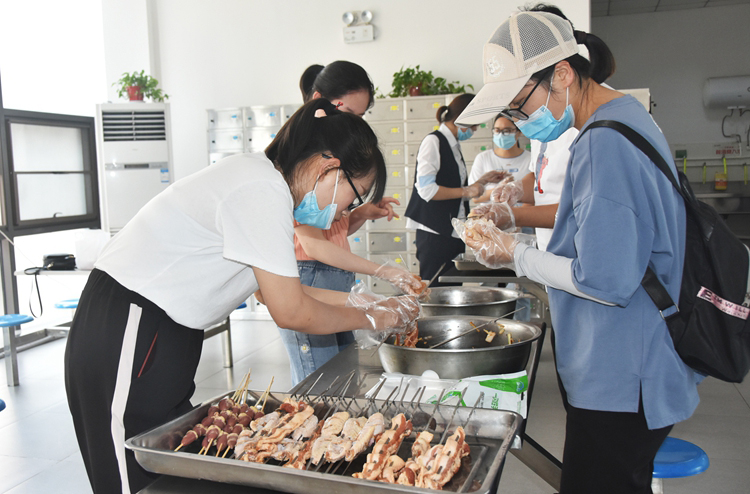 大家通力协作,互相配合,没过多久,一串串鲜香诱人,令人垂涎欲滴的烤肉食材加工完成了,等待大家大显生手!