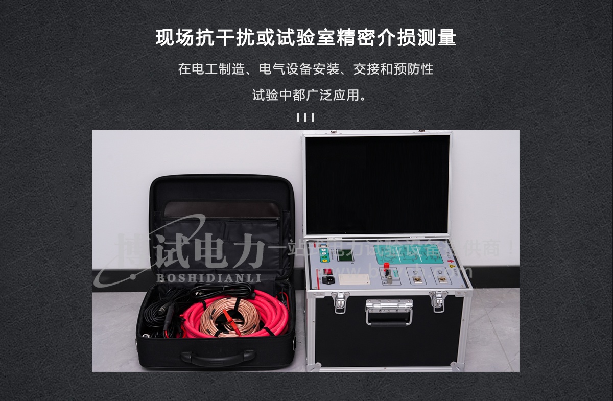 全自动变频抗干扰介质损耗测试仪用于现场抗干扰介损测量,或试验室精密介损测量。可以有效地发现电器设备绝缘的整体受潮劣化变质,以及局部缺陷等,在电工制造、电气设备安装、交接和预防性试验中都广泛应用。